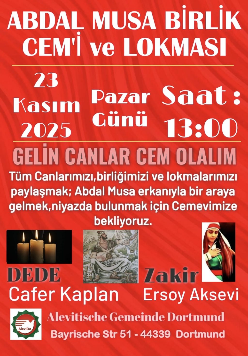 ⌈Haber Merkezi⌉ Alevitische Gemeinde Dortmund, 23 Kasım 2025 Pazar günü saat 13.00’te Abdal Musa Birlik Cemi ve lokma paylaşımı düzenleyeceğini...