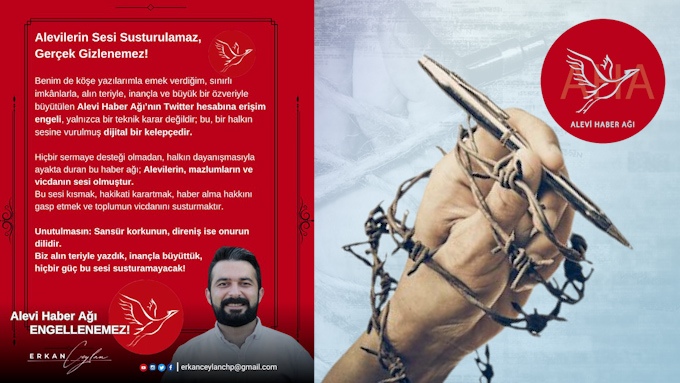 Alevi toplumunun özgür sesi olan Alevi Haber Ağı (AHA)’nın X hesabına getirilen erişim engeline tepkiler sürüyor. Alevi kamuoyunun önde gelen...