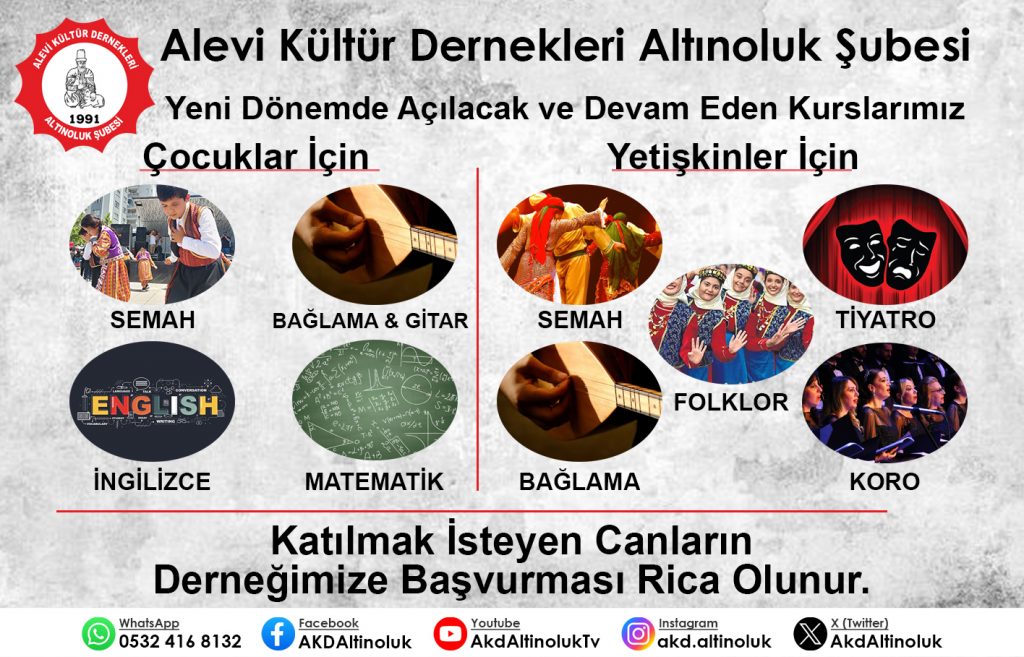 ⌈Haber Merkezi⌉ Alevi Kültür Dernekleri Altınoluk Şubesi, yeni dönemde hem çocuklar hem de yetişkinler için açtığı kurslarla kültürel ve sanatsal...