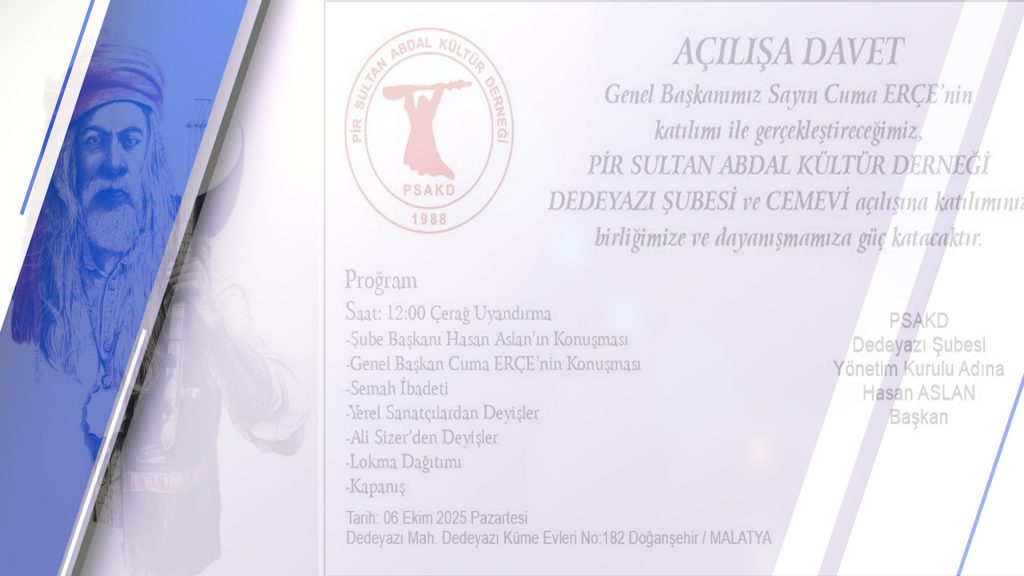 ⌈Haber Merkezi⌉ Malatya’nın Doğanşehir ilçesine bağlı Dedeyazı Mahallesi’nde Pir Sultan Abdal Kültür Derneği (PSAKD) Dedeyazı Şubesi ve Cemevi açılışı yapılacak....