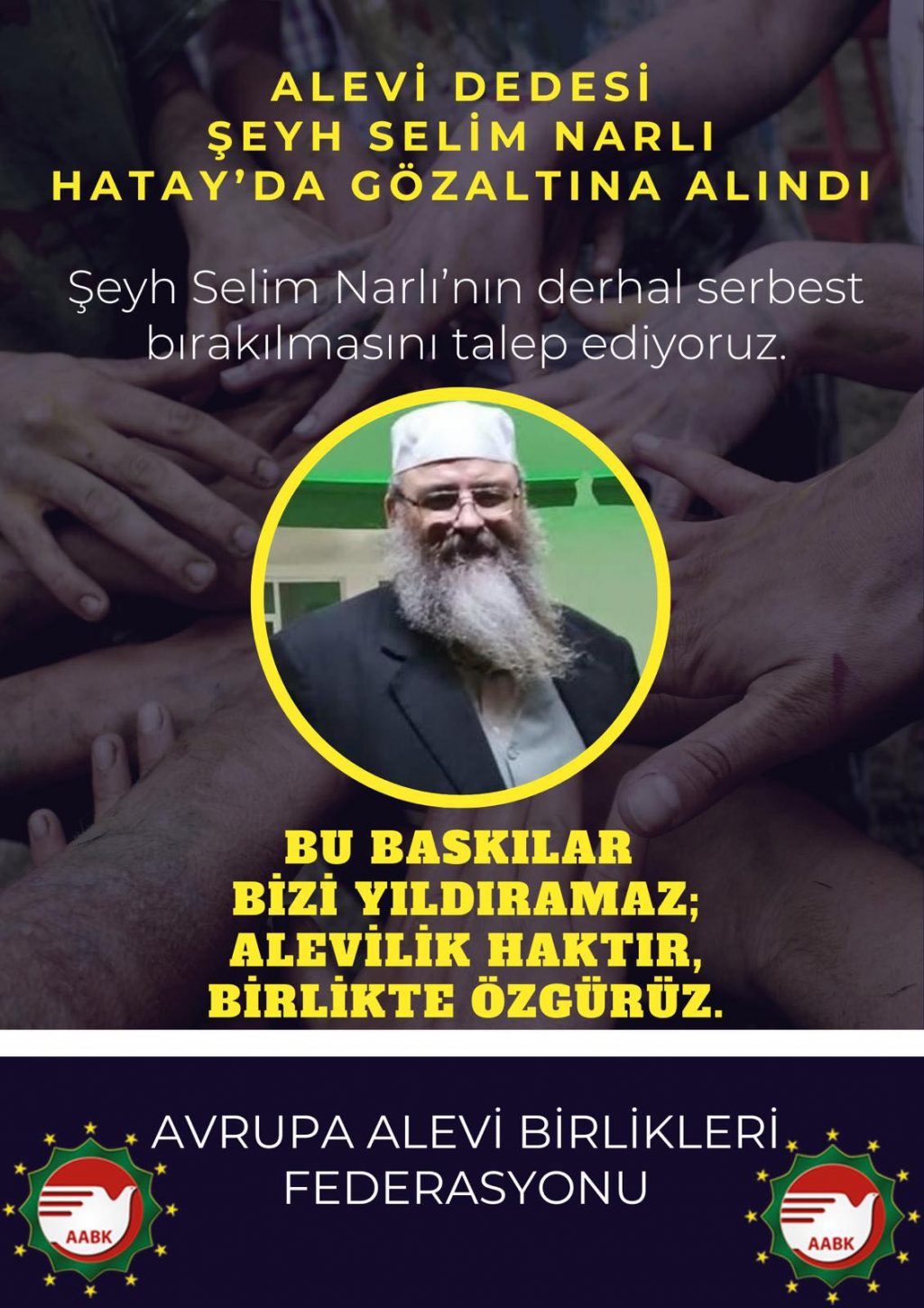⌈Haber Merkezi⌉ Avrupa Alevi Birlikleri Konfederasyonu (AABK), Alevi Dedesi Şeyh Selim Narlı’nın Hatay Havaalanı’nda gözaltına alınmasına sert tepki gösterdi. AABK...