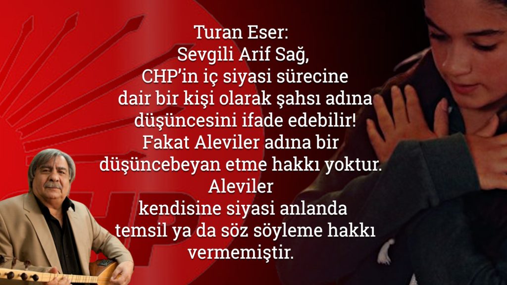 ⌈Turan Eser⌉ Arif Sağ, CHP’in iç siyasi sürecine dair bir kişi olarak şahsı adına düşüncesini ifade edebilir.Fakat Aleviler adına bir...