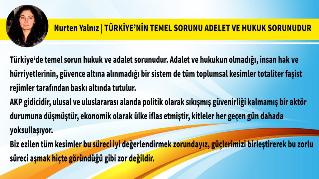 -Nurten Yalnız- Türkiye‘de temel sorun hukuk ve adalet sorunudur. Adalet ve hukukun olmadığı, insan hak ve hürriyetlerinin, güvence altına alınmadığı...