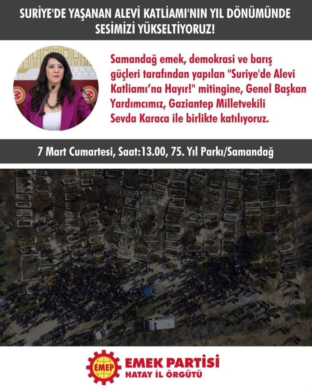 ⌈AHA⌉ Emek Partisi (EMEP) Hatay İl Örgütü, Suriye’de Alevilere yönelik saldırıların birinci yılı dolayısıyla 7 Mart’ta Hatay’ın Samandağ ilçesinde düzenlenecek...