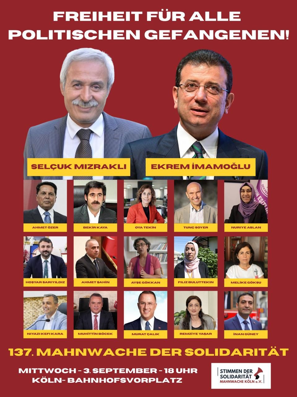 ⌈Hasan Subaşı - Köln⌉ Köln’de faaliyet gösteren Stimmen der Solidarität inisiyatifi, 3 Eylül 2025 Çarşamba günü saat 18.00’de Köln Merkez...