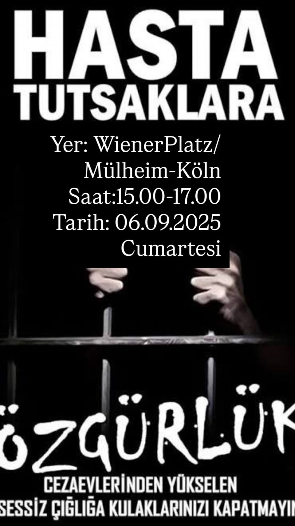 ⌈Haber Merkezi⌉ Köln’ün Mülheim semtinde 6 Eylül 2025’te yapılacak eylemde, ölüm orucunun 285. günündeki Serkan Onur Yılmaz şahsında tüm devrimci...