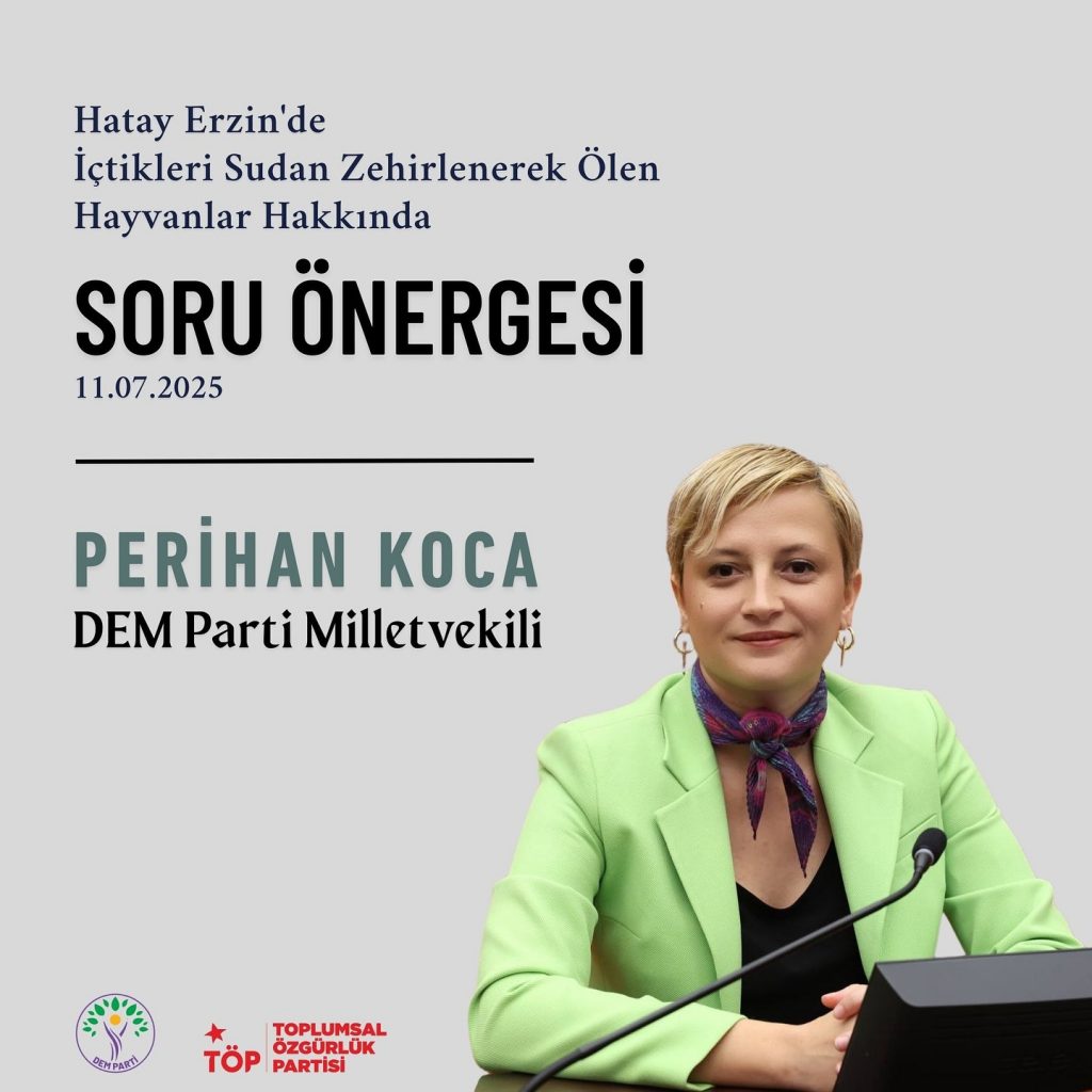 DEM Parti İstanbul Milletvekili Perihan Koca, Hatay’ın Erzin ilçesinde içtikleri sudan zehirlenerek yaşamını yitiren hayvanlarla ilgili olarak Çevre, Şehircilik ve...